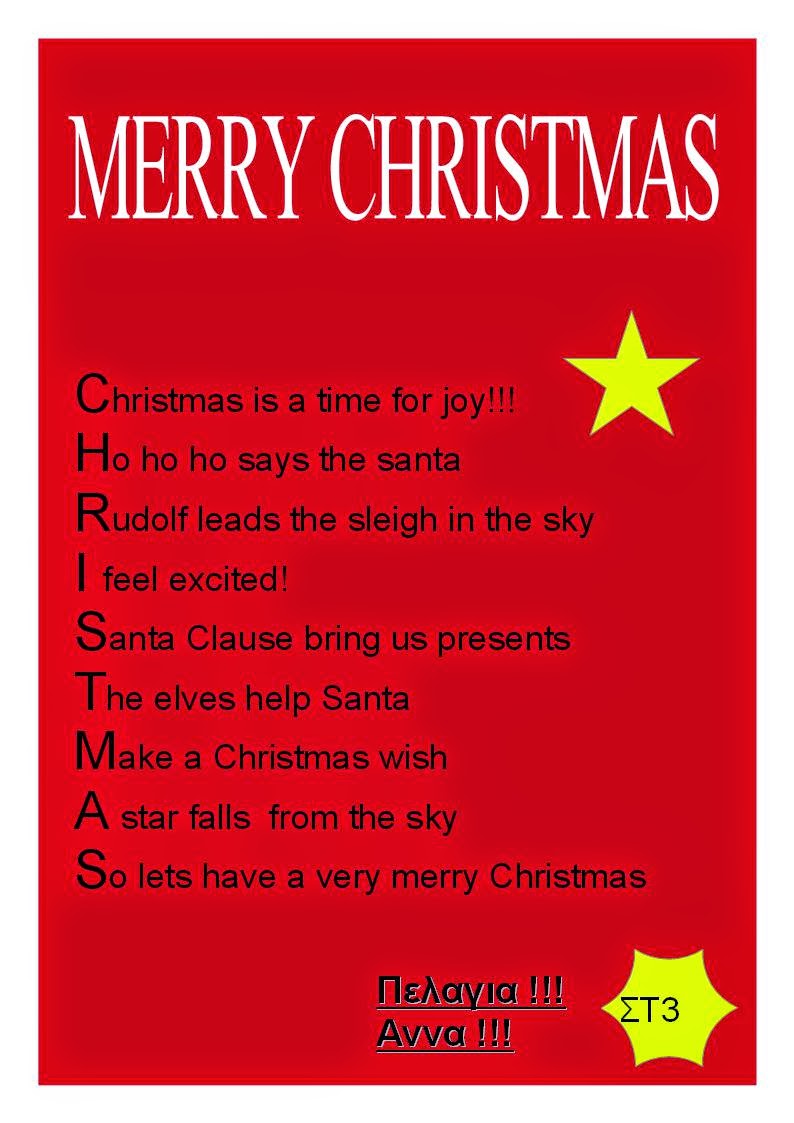 Στο πλαίσιο των μαθημάτων Τ.Π.Ε. και Αγγλικών, οι μαθητές και οι μαθήτριες του ΣΤ3 έφτιαξαν αφίσες με ακροστιχίδες για τα Χριστούγεννα.